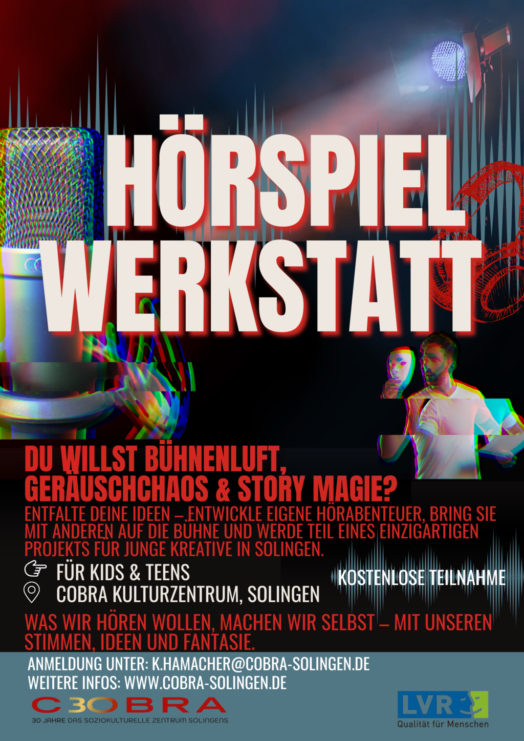 Ihr denkt euch eine Geschichte aus, verteilt die Rollen, plant passende Geräusche und setzt alles kreativ um. Wir zeigen euch, wie ihr Töne erzeugen könnt, unterstützen euch bei der Aufnahme und beim Schnitt – doch das meiste macht ihr selbstständig mit unserer Hilfe! Am Ende des Projekts präsentiert ihr euer Hörspiel auf der COBRA Bühne.